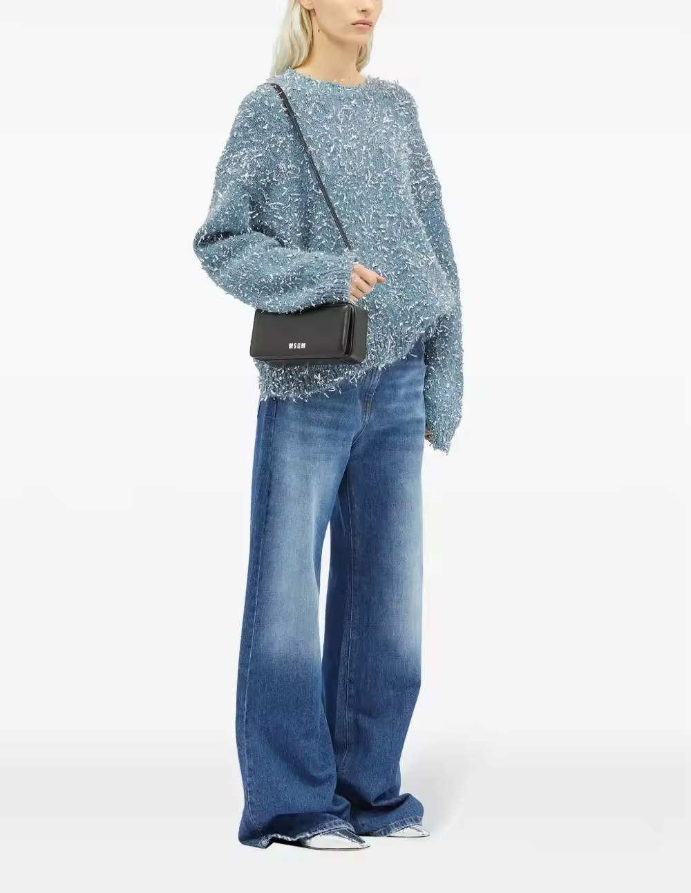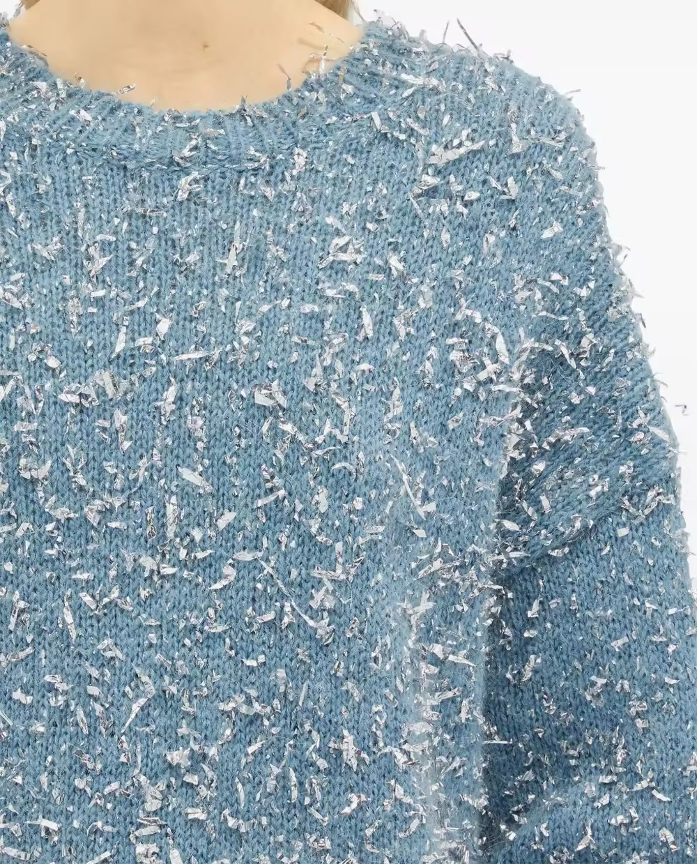 2025 New Fashionable Blue Mohair Blend Knit Sweater with Ribbed Hem Long Sleeve Sweater